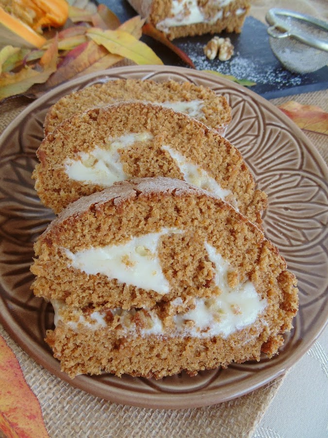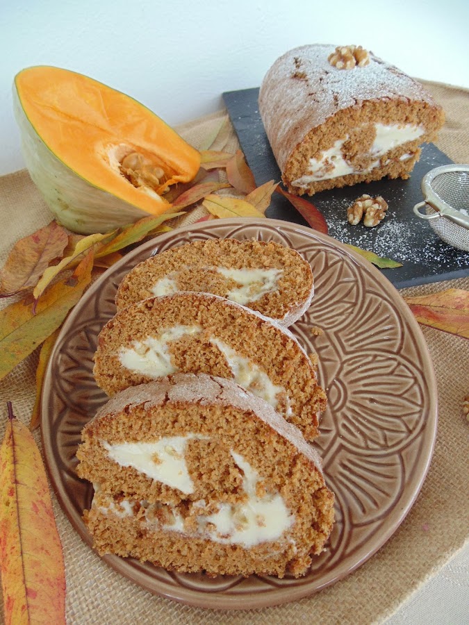 Mi propuesta para el postre de Acción de Gracias que tendrá lugar el próximo 22 de noviembre, es un roll de calabaza relleno de un frosting de mascarpone y nueces que hará que nos dure muy poco tiempo en el plato! Parece broma pero así es! Es un tierno bizcocho de calabaza con un frosting súper suave de mascarpone y el toque crunch y saludable de las nueces. Apetece más que nunca en pleno otoño como estamos. Espero que os guste!