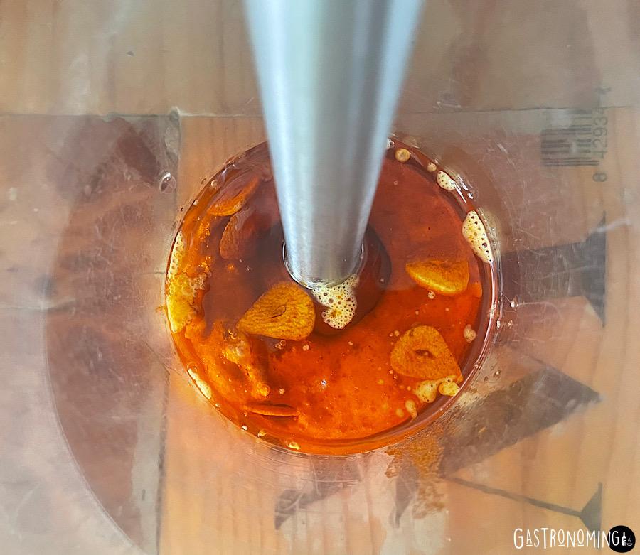 4. Ahora hacemos la “mayonesa a feira”. En un vaso, ponemos el huevo, la sal gorda, añadimos el aceite con los ajos dorados y el pimentón, metemos la batidora manual hasta emulsionar y obtener la textura de una mayonesa. La metemos en un biberón y guardamos en frío.