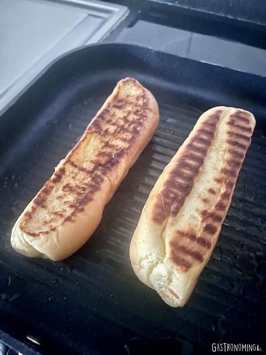 5. Untamos la mantequilla en la sartén, ahora, doramos cada bollo de pan por ambos lados. Cortamos los panes a la mitad por la parte de arriba sin llegar hasta el final.