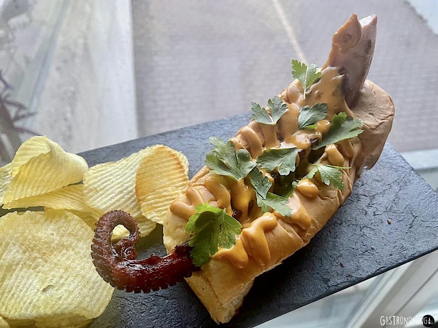 Ahora bien, cabe aclarar, que para que el Pulpo a feira, sea denominado tal cual, este debe estar compuesto solo por pulpo cocido, aceite de oliva y pimentón, si a este le añadimos cachelos, o sea, patatas, es conocido como Pulpo a la gallega. Entonces, dicho todo esto, lo que haremos es, al pulpo ya cocido, le daremos un toque de sartén o parrilla para darle más sabor, y con los otros ingredientes, ya sabes, aceite, sal marina, ajos y pimentón, le añadiremos un huevo, lo trituraremos todo y lo emulsionamos hasta crear una “mayonesa a feira” y si quieres hacerlo a la gallega, vamos añadirle unas patatas fritas cortadas muy finas, así todos los ingredientes de este o estos platos, los transformamos para crear este sándwich, Galicia en un bocado.