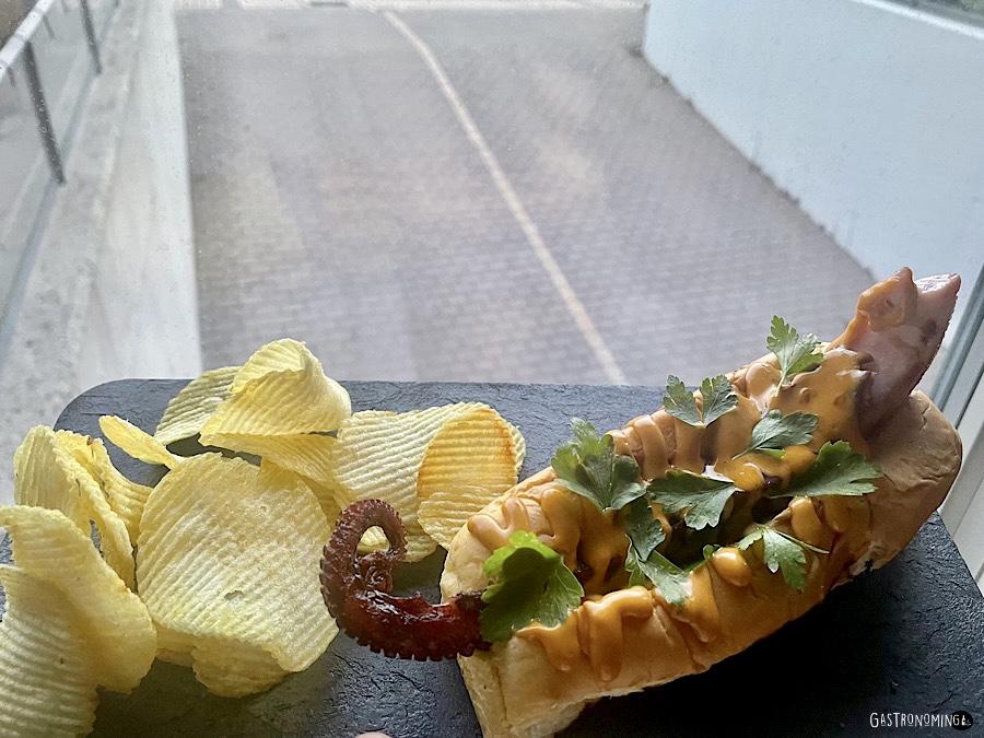 6. Cuando el pulpo esté templado, puedes dejar la pata entera, que es más vistoso o puedes cortarlo en laminas sesgadas del grosor que más te guste y lo metes en el pan, añadimos la “mayonesa a feira”, sin miedo, echa como si no hubiese un mañana que está sabrosísima y por último rociamos unas hojas de perejil o si te atreves de cilantro picado para aportar más frescor. Servimos acompañando con unos “chips” de patata y disfrutamos es este delicioso bocado.
