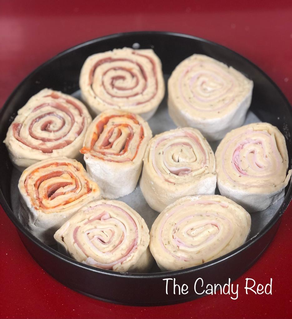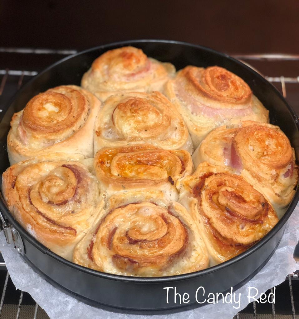 Seguidamente, cortaremos en rodajas nuestro rollo e iremos colocándolas en una fuente apta para horno la cual habremos engrasado previamente. Os recomiendo dejar espacio entre rodaja y rodaja ya que al hornear la masa sube bastante.