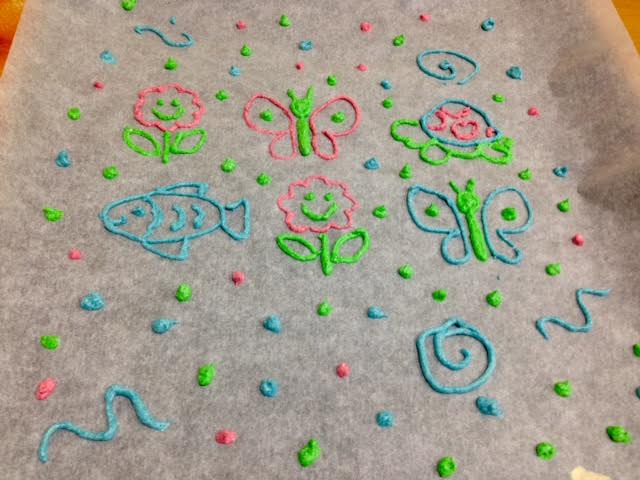 Sobre un paper vegetal amb l’ajuda de mànigues pastisseres fem els dibuixos que prèviament haurem seleccionat i imprès en un paper.