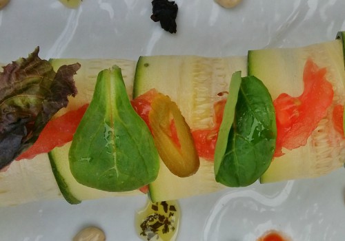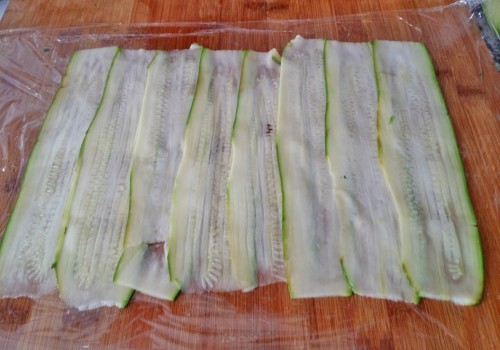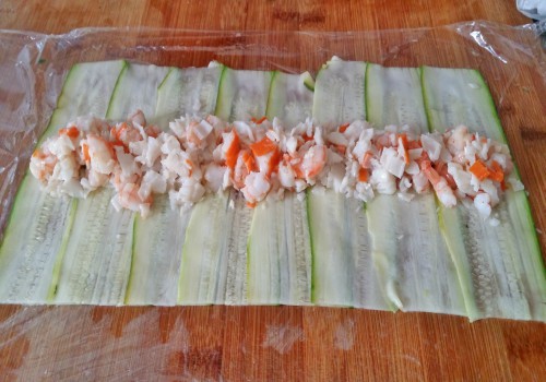 Poner este relleno en las tiras de calabacín haciendo una tira.