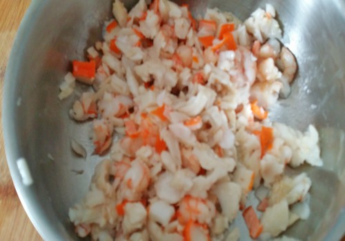 Sacar de la sartén y, cuando esté frío, añadir los palitos de cangrejo a trocitos.