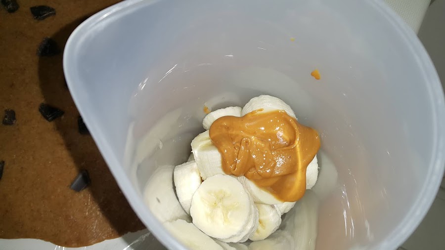 A continuación batimos los 2 plátanos con una cucharada de crema de cacahuate para darle sabor.