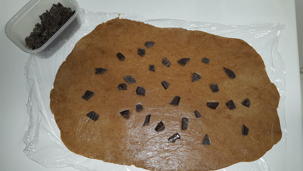 Seguidamente picamos las 2 onzas de chocolate y repartimos por la masa, habiendo retirado el film superior.