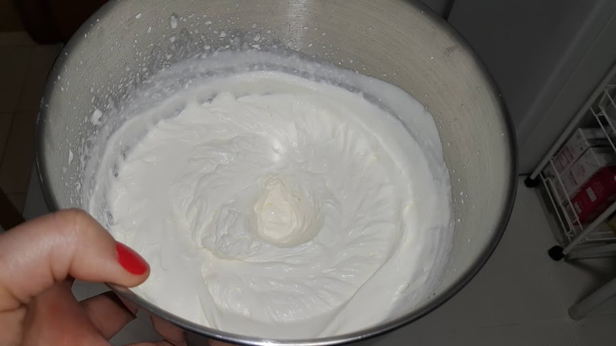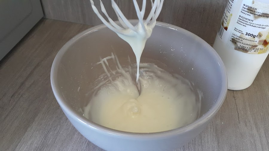 Dejamos la masa un momento aparte y nos ponemos con la crema de plátano. Primero montaremos la nata (crema de leche). Ésta debe de estar bien fría para que monte rápido y bien.