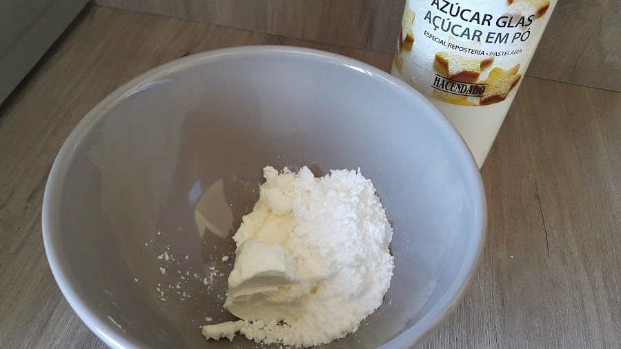 Preparamos el glaseado mezclando una cucharada de queso crema con 3 de azúcar glas.