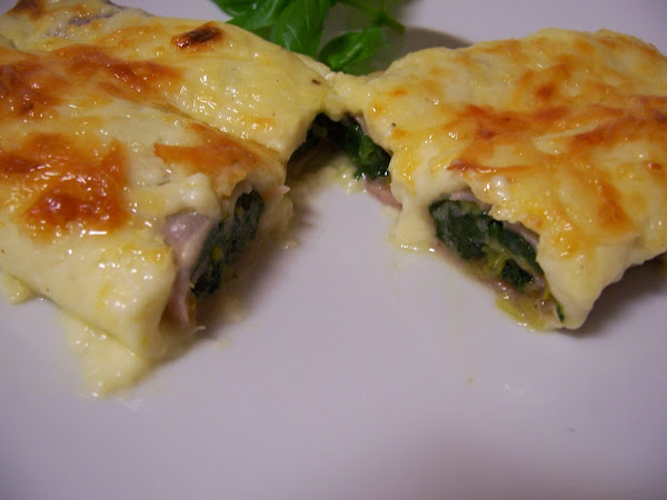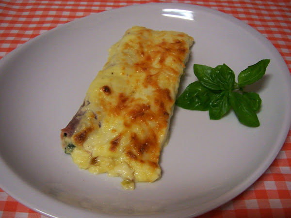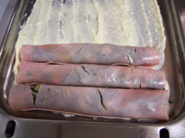 Cubrimos el fondo de una fuente para horno con una capa fina de bechamel y vamos poniendo los rollitos de jamón rellenos de verdura.