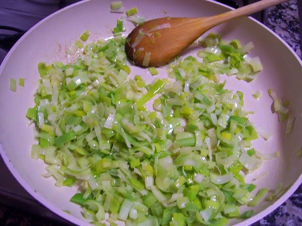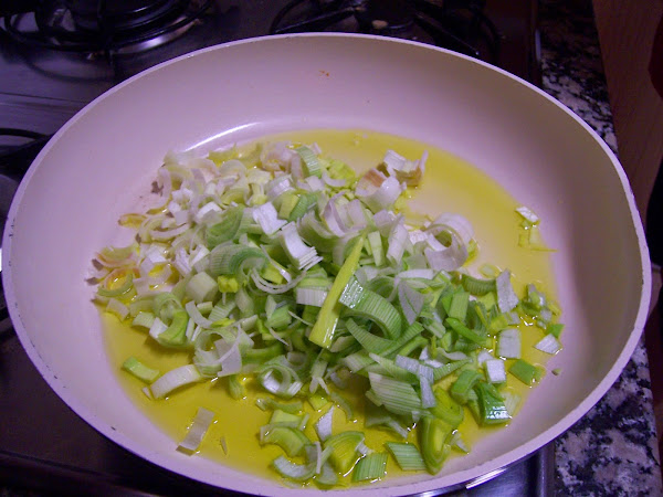Rehogamos el puerro con un chorrito de aceite y sal durante unos 10 minutos y añadimos las espinacas y dejamos que suelten el agua.