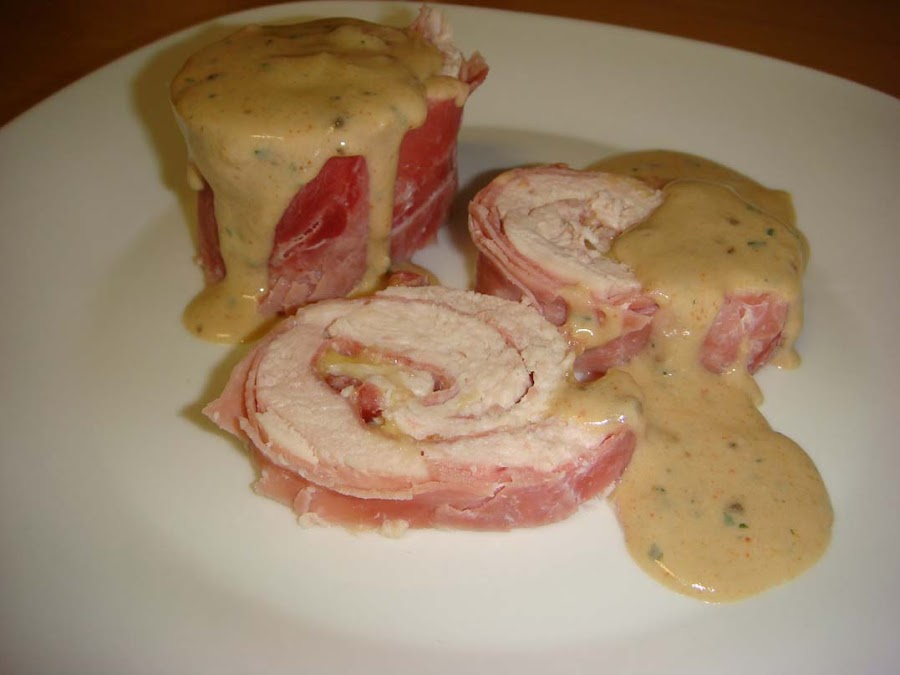 Elaboración: Extendemos en una bandeja 6 lonchas de York, ponemos encima todos los filetes de pollo, menos 3 que reservamos para después. Sobre el pollo, ponemos las lonchas de pavo, las de queso y los trocitos de bacon. cubrimos con las 3 lonchas de York que nos quedaban y con los 3 filetes de pollo. Ahora tenemos que enrollar con paciencia para formar un rulo. Es fácil de hacer si vas despacito. Cuando esté formado el rollo, lo cubrimos bien con papel transparente de cocina, hay que darle muchas vueltas y apretar bien para que quede muy bien sellado. Una vez hecho esto, lo colocamos en una fuente y pinchamos el plástico un poquito para dejar que respire al hornear. Yo lo meto en el microondas durante 17 min a potencia máxima, pero se puede cocer al horno o al vapor. Cuando esté cocido sólo nos queda sacarlo del plástico, cortarlo en rodajas y servir. Se puede comer tanto frío como caliente y admite muchas salsas....de roquefort, de pimienta verde, de tomate.....yo esta vez lo he preparado con salsa de champiñón: