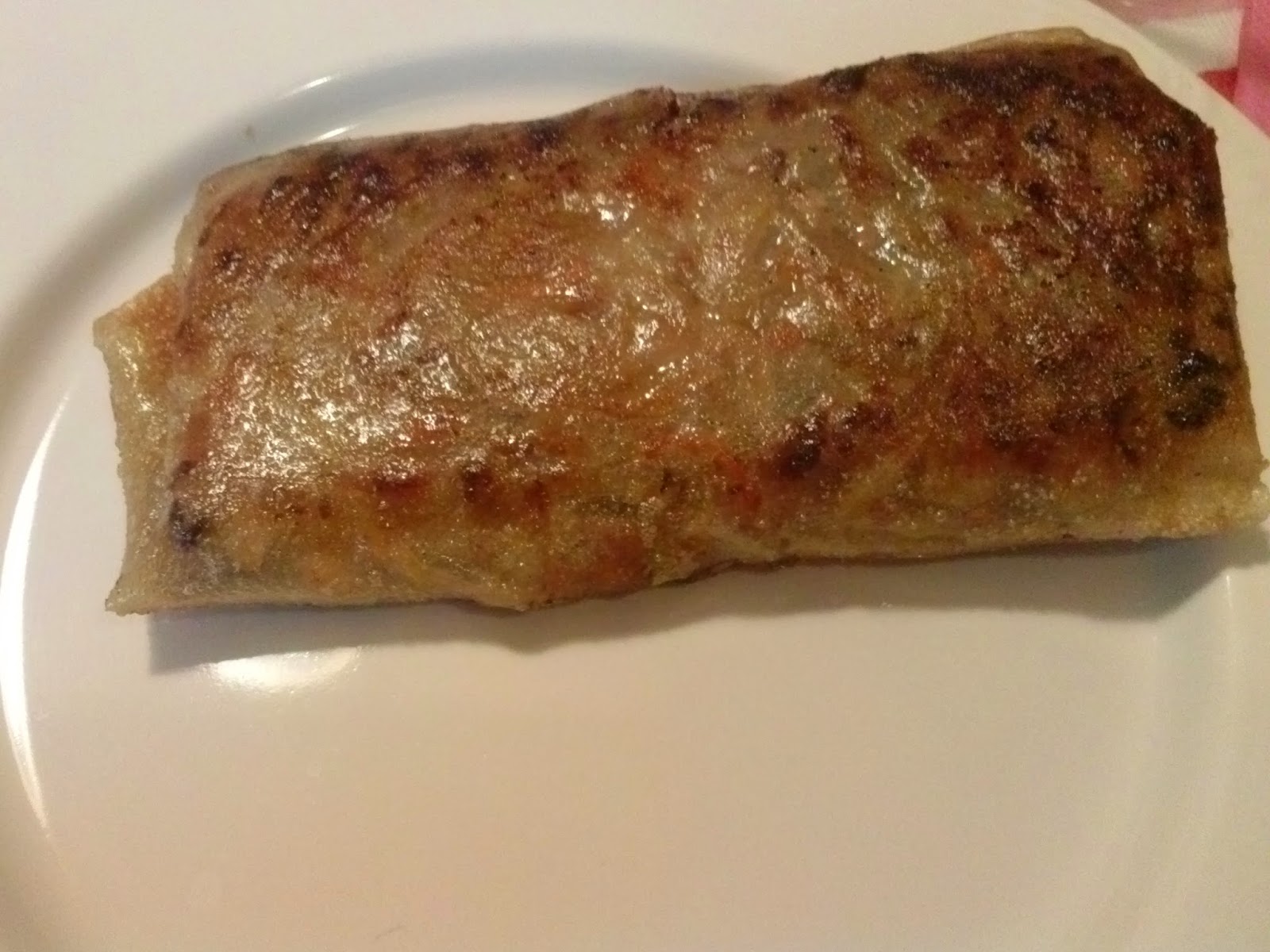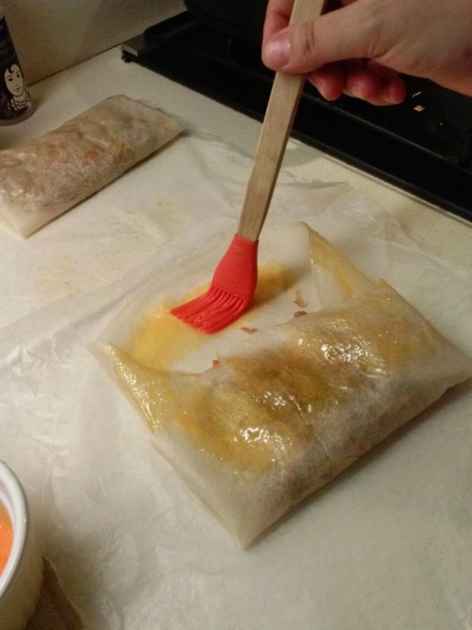 Ahora vamos a montar los rollitos. Separamos con cuidado las hojas de pasta brick. Vamos poniendo relleno y cerrando. Para que pegue mejor os aconsejo pintar con yema de huevo.