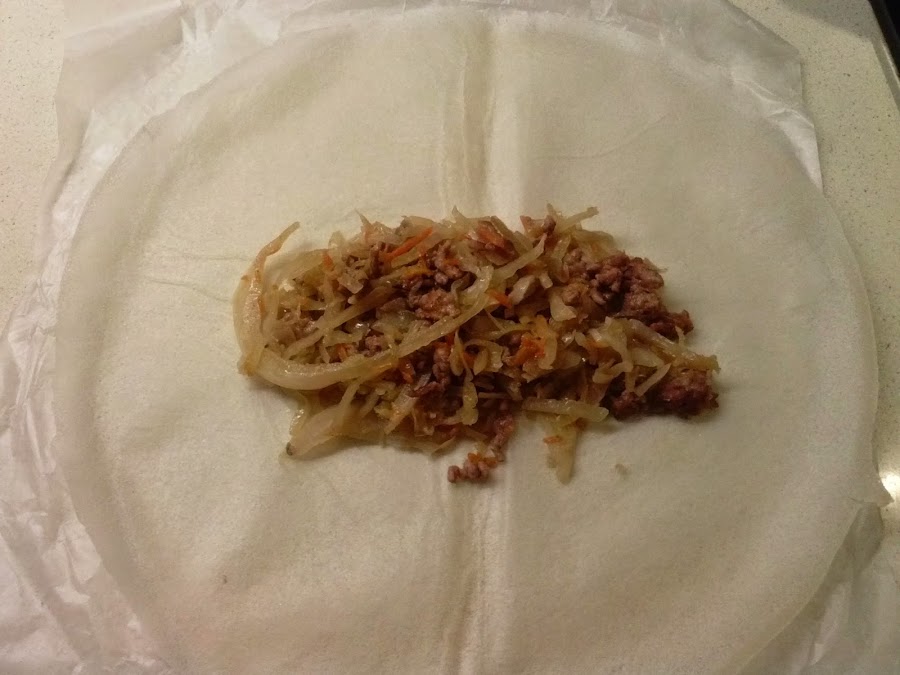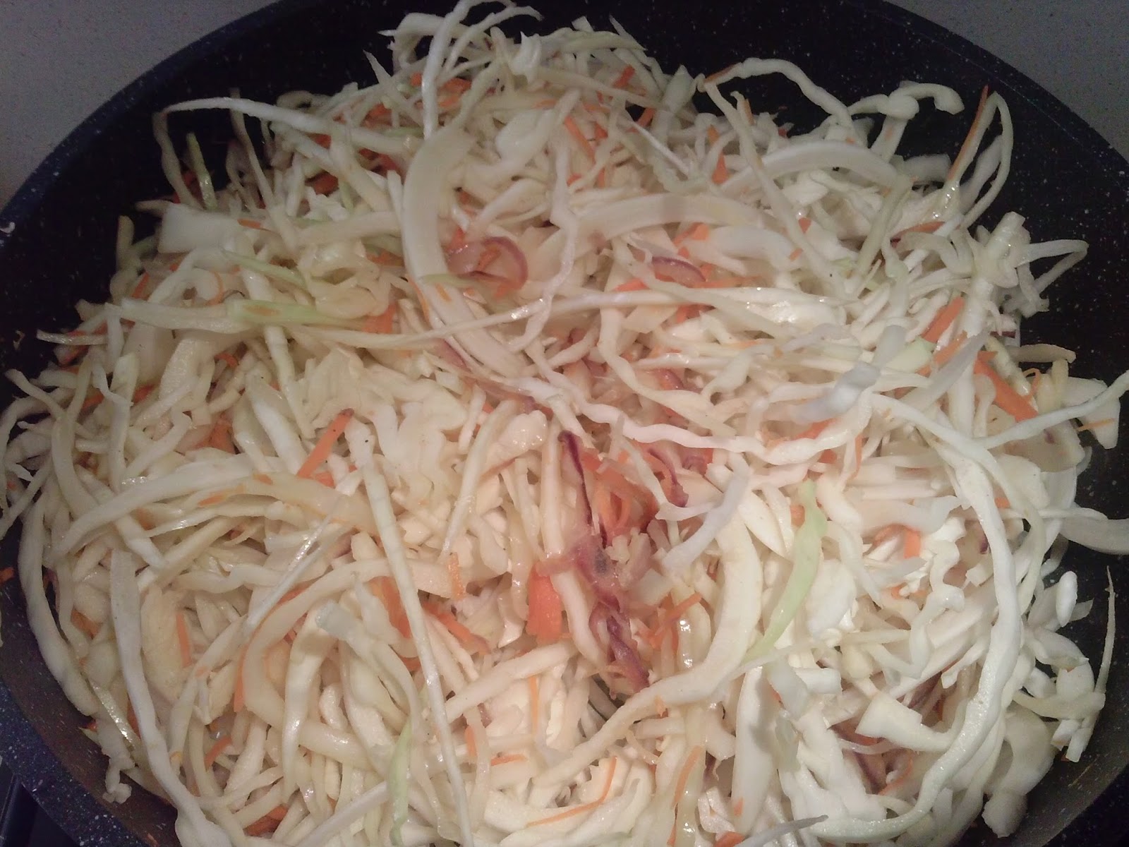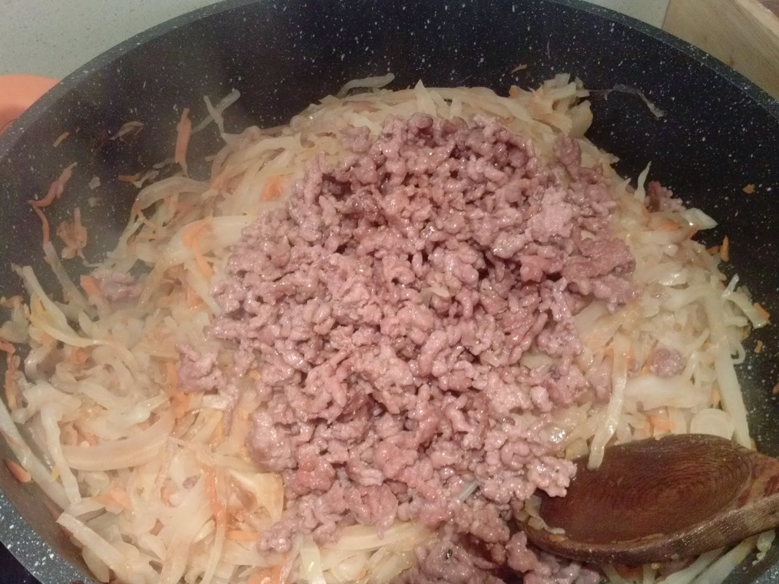 Salpimentamos la carne y la cocinamos hasta que quede bien dorada y suelta. Retiramos y en la misma sartén vamos a poner la cebolla con un poco de sal. Cuando este blandita ponemos la zanahoria y el repollo. Le damos unas vueltas. Añadimos agua, tapamos y dejamos cocinar hasta que las verduras cambien de color. Cuando lo tengamos hecho añadimos de nuevo la carne y una cucharada de salsa de soja. Cocinamos un par de minutos más y reservamos.