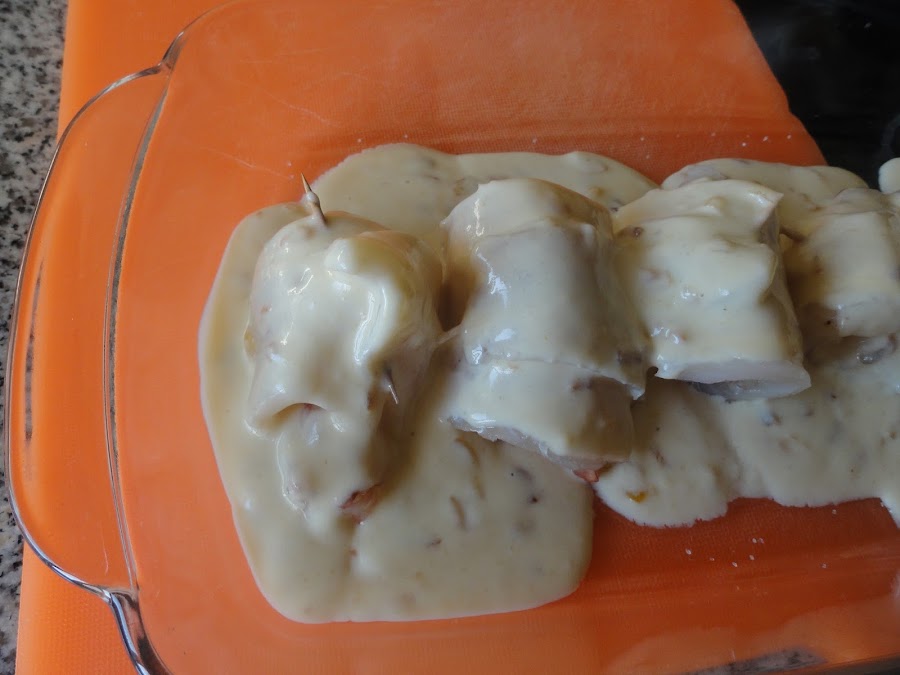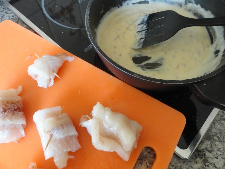 Salpimentamos los filetes de pescado, ponemos el marisco y enrollamos, lo cerramos con un palillo.