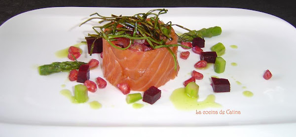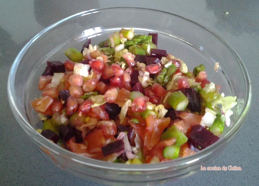 En un bol, mezclamos la lechuga, la remolacha, los espárragos, los granos de la granada y los recortes de salmón picado. Aliñar con el aceite y el limón, sazonar y dejar macerar al menos media hora.