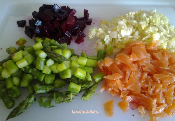 Picar el cogollo de lechuga finamente, la remolacha y los espárragos.
