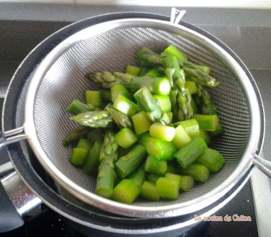 Limpiar los espárragos, quitarle los trozos más duros y cocerlos en agua con sal durante 8 minutos. Reservar.