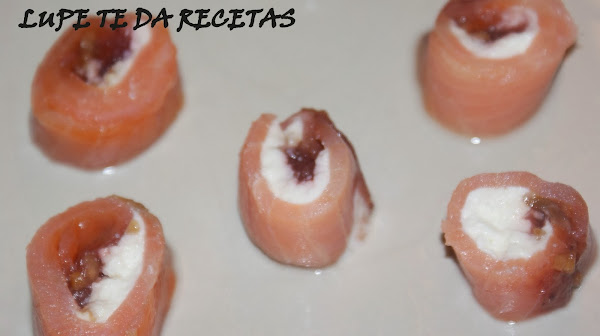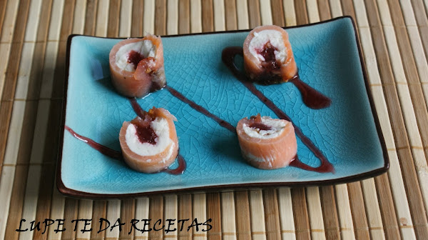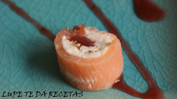 Colocar las dos lonchas de salmón, de forma que una monte un poco encima de la otra y parezca una sola loncha más larga.