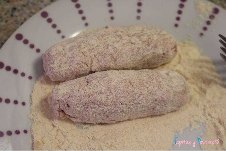 Preparamos un plato con harina y hacemos rollitos con la carne. Los rollitos tienen que ser mas o menos del mismo grosor y tamaño. Los rebozamos con la harina y los freímos en abundante aceite caliente hasta que la carne esté hecha. Dejamos templar.