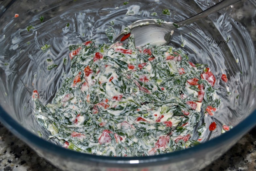 Ponemos en un bol las acelgas, cortamos con unas tijeras que quede muy menudas, añadimos el queso y el pimiento también en trozos muy pequeños.