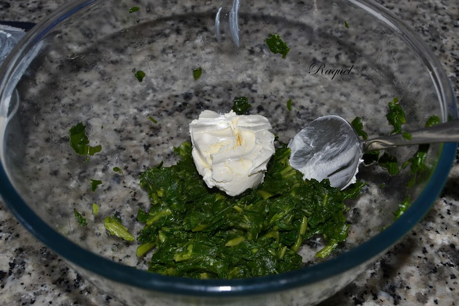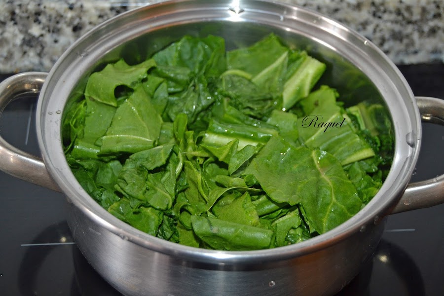 Hacemos a trozos pequeños las hojas y las cocemos en agua y sal durante diez minutos, escurrimos y reservamos.
