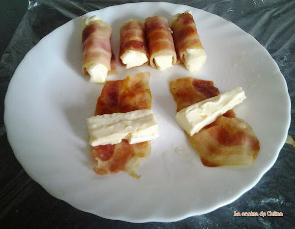 Estiramos las lonchas de bacon, le ponemos un trozo de queso en medio y enrollamos.