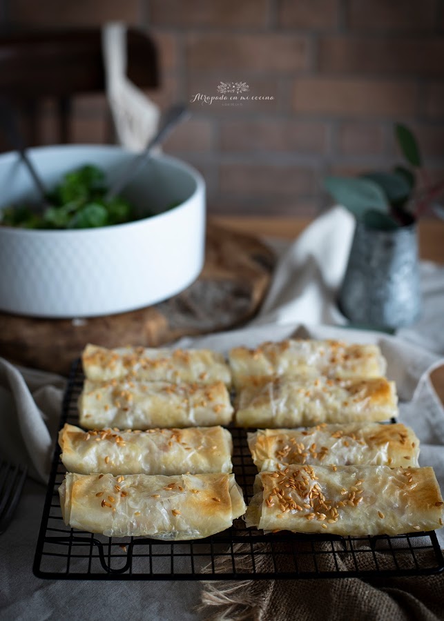 Cortamos cada hoja de masa filo en dos mitades, y añadimos dos cucharadas de relleno, encima ponemos un poco de queso rallado y empezamos a enrollar. Cuando le damos el primer giro podemos doblar los extremos un poquito y seguir enrollando (en el vídeo lo podéis ver claramente). Pegamos el extremo del rollo con un poco de mantequilla y después pintamos la superficie también con mantequilla. Disponemos todos los rollitos en una bandeja de horno. Añadimos semillas de lino por encima y llevamos al horno precalentado a 180º durante 15 minutos.