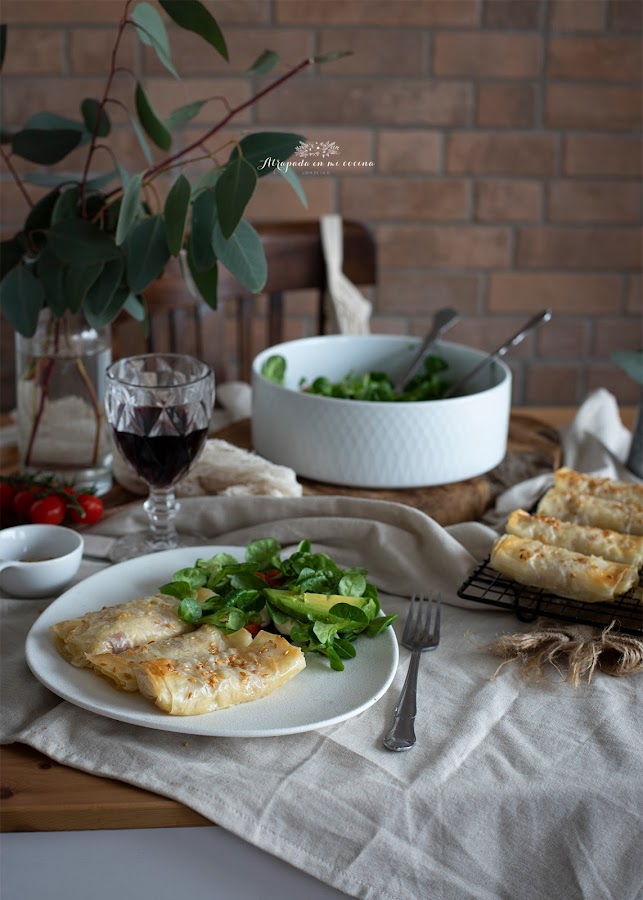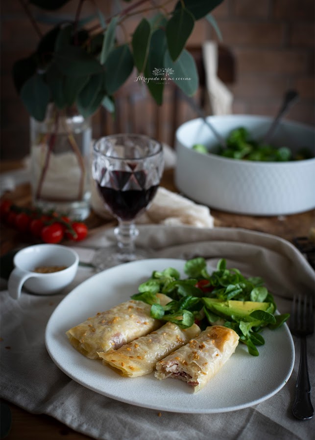 La masa filo da muchísimo juego en la cocina, se puede usar tanto para recetas saladas como para recetas dulces, y cuando lo preparamos en forma de rollito podemos meterle cualquier relleno. En esta ocasión lleva una mezcla de pollo y bacon, además de un poco de queso rallado. En su superficie crujiente le hemos puesto semillas de lino. La combinación es perfecta y el resultado buenísimo tanto para un almuerzo como para una cena.