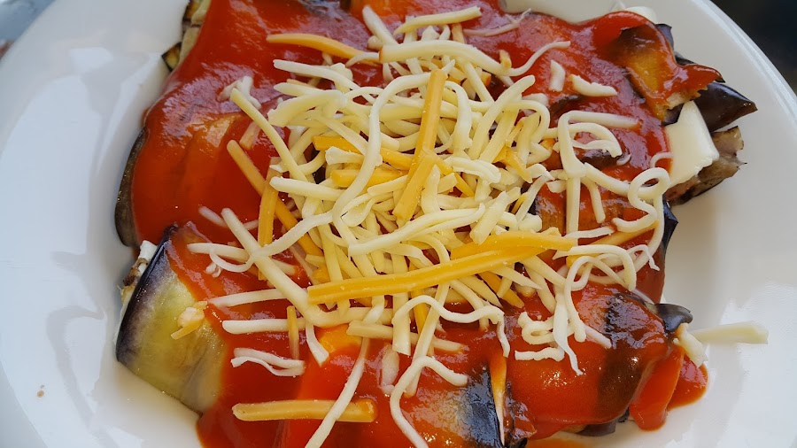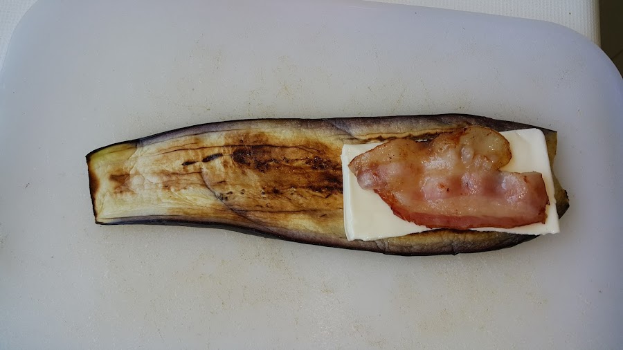 Seguidamente, pondremos sobre cada lámina de berenjena, media loncha de queso y media tira de bacon.