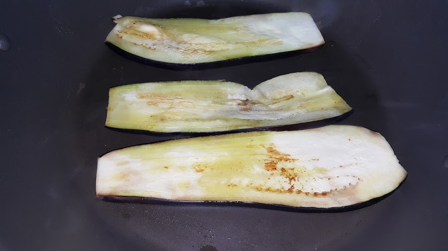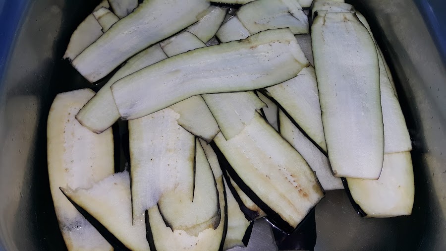 Una vez tengamos la berenjena laminada, la ponemos en agua con sal durante unos minutos para que no amargue.