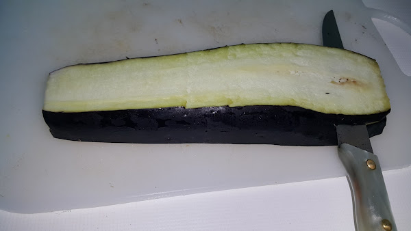 Lo primero que haremos será cortar en láminas las berenjenas. Si disponéis de mandolina mejor, sino se puede ir haciendo con un cuchillo afilado.