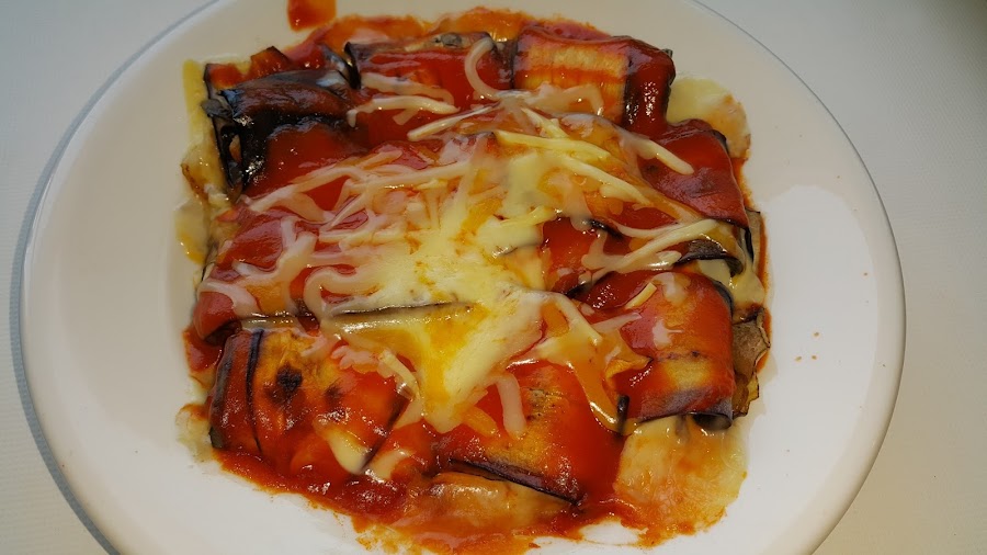 Enrollamos las berenjenas y las vamos colocando en un plato o fuente aptos para horno o microondas.