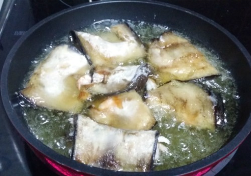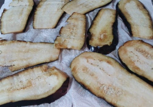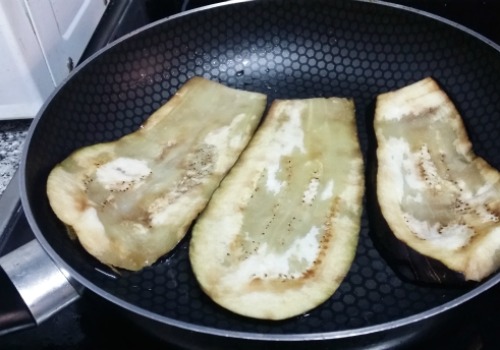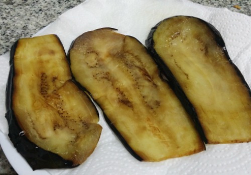 Lavamos las láminas de berenjena y las secamos bien. Ponemos una sartén con un poco de aceite y pasamos cada lámina de berenjena a dorar.