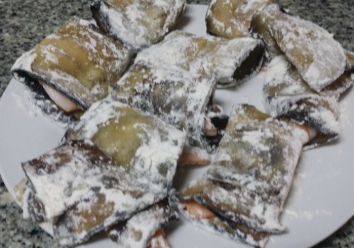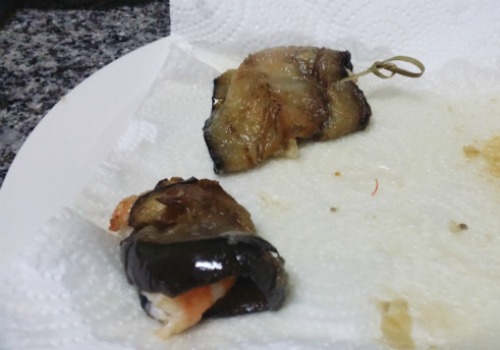 Para montar los rollitos, ponemos una lámina de berenjena estirada y metemos un langostino dentro.