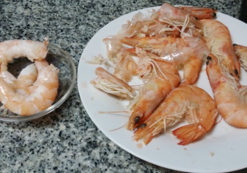 Con una media hora es suficiente. Mientras, quitamos la cabeza y la cáscara a los langostinos y los ponemos en un platito, listos para hacer los rollitos.