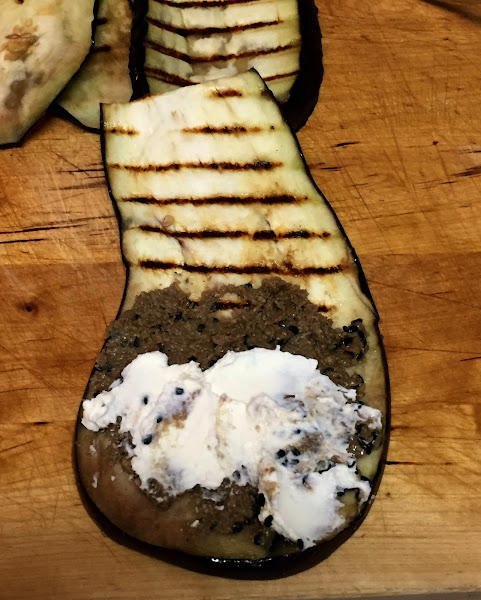 Cocinar las berenjenas en una parrilla o plancha con un poco de aceite hasta que quede un poco blanda. Rellenar cada lámina en un extremo con un poco de tahini, queso crema y la cebolla y enrollar sobre sí misma pinchando con un palillo para que no se desenrolle.