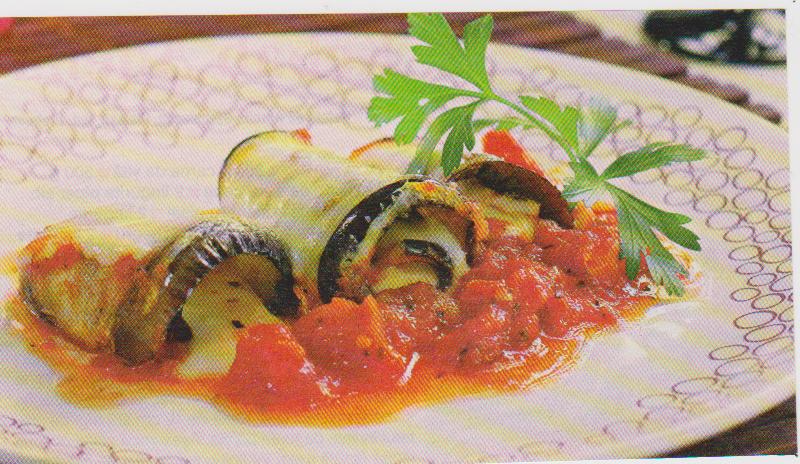 Ahora cogemos cada una de las rebanadas de berenjena y las rellenamos así: primero una capa de parmesano rallado, luego una capa de pasas y al final unas lonchas de mozzarella. Enrollamos y los echamos en la salsa de tomate. Ponemos encima de cada rollito otra loncha de mozzarella, tapamos y dejamos cocer hasta que se funde la mozzarela. Gratinamos en el horno por 5 minutos. Si queréis le podéis echar un poquito mas de parmesano.