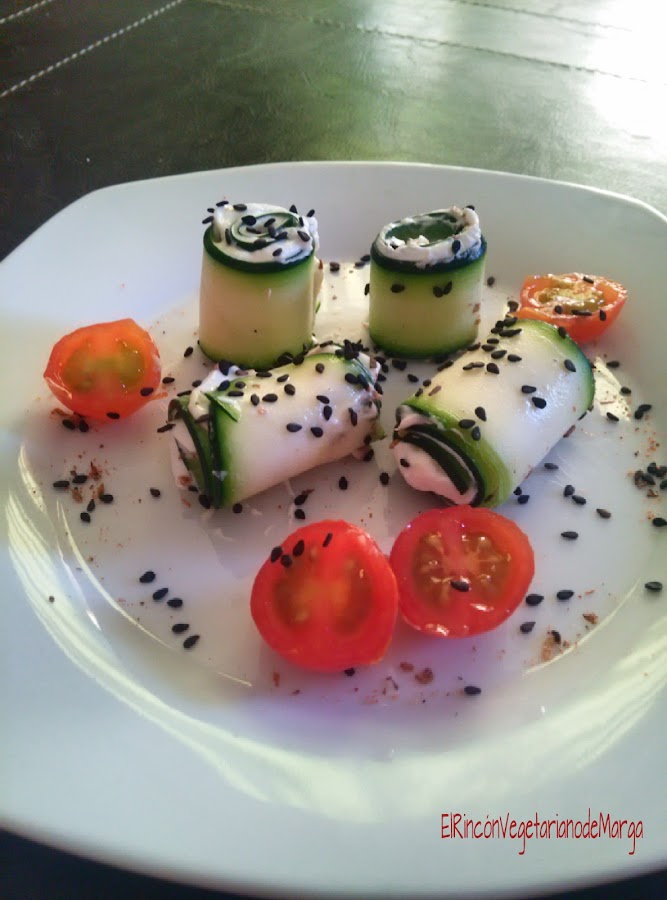 Una opción vegetariana serían unos rollitos de calabacín con queso de untar light y orégano.