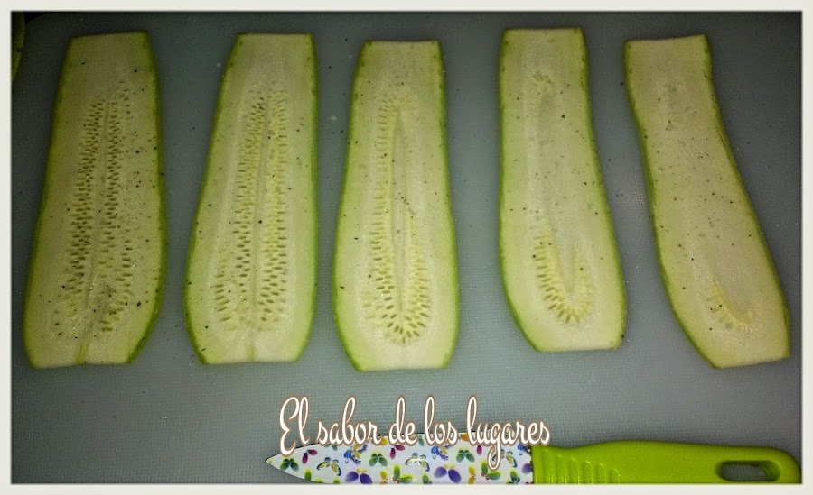 Primero, retira las puntas al calabacín y córtalos con una mandolina o cuchillo bien afilado en lonchas a lo largo muy finas ( de unos 2 milímetros aproximadamente). Colócalos sobre un colador o escurridor, sálalos ligeramente y déjalos reposar unos 20 minutos para que suelten el agua.