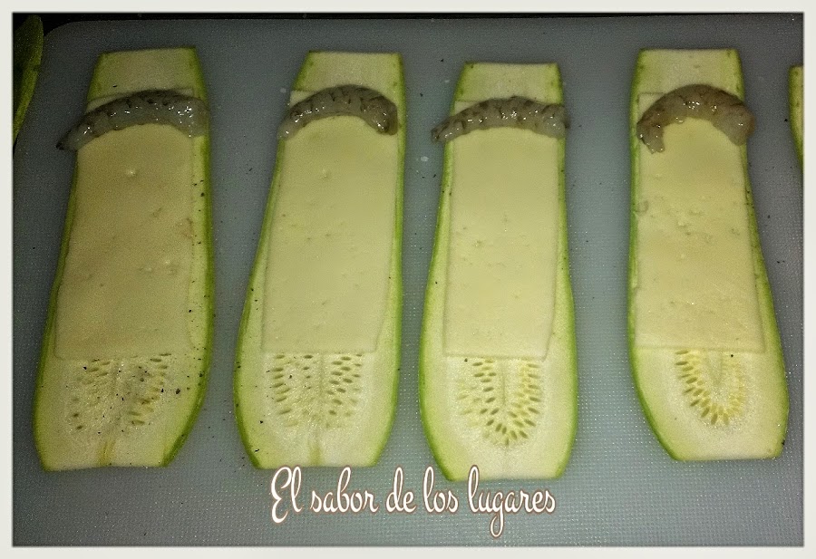 A continuacíón, secalos con papel de cocina y salpimienta. Coloca encima una tira de queso (yo en dividido cada loncha de queso en 3 partes para que tuviera el mismo ancho que las lonchas de calabacín) y en una de las puntas pon un langostino.