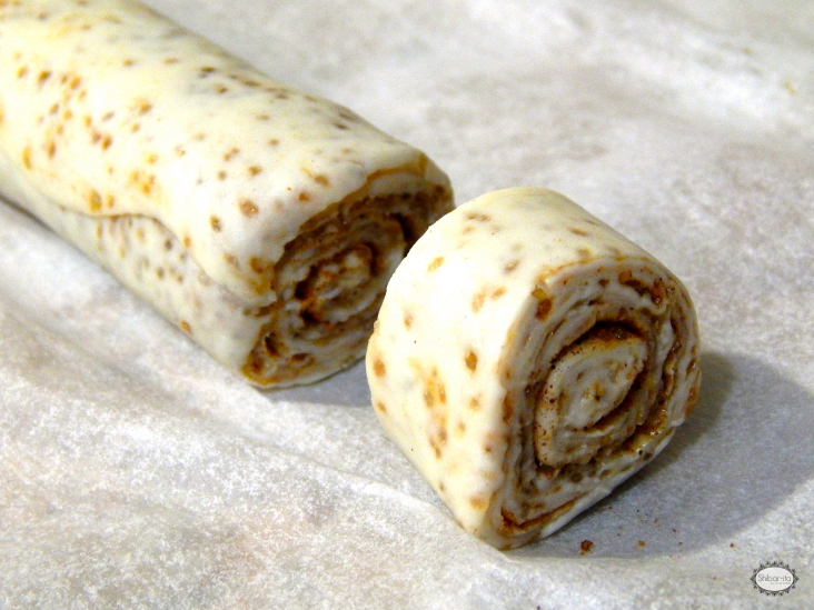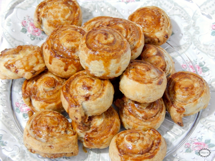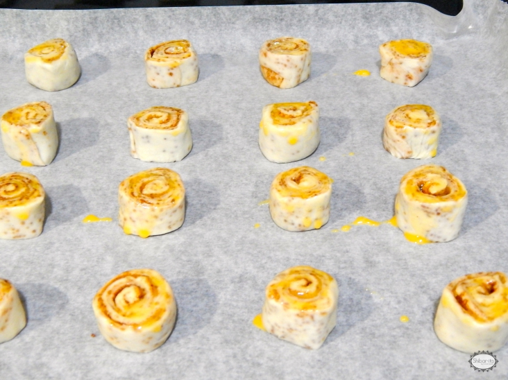 Enrollaremos la masa a lo largo hasta obtener un "churro" alargado. Con un cuchillo liso iremos cortando los rollitos con una anchura de un poco menos de 2 cm, que queden más o menos todos igual de tamaño. Los disponemos en una bandeja de horno con un papel vegetal en la base, es importante que estén separados ya que luego crecen y no queremos que se nos peguen entre ellos. Pincelamos las superficies con huevo batido y horneamos durante 10-15 min a 210º (es preferible que sigáis las recomendaciones del fabricante de la masa). Cuando los rollitos estén dorados ya se pueden retirar del horno y los pasamos a enfriar a una rejilla.