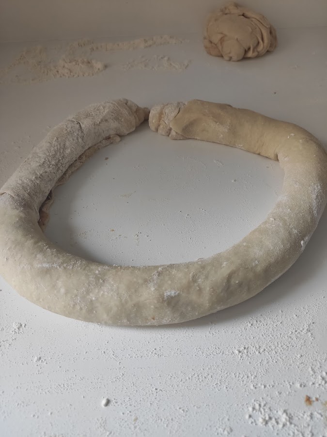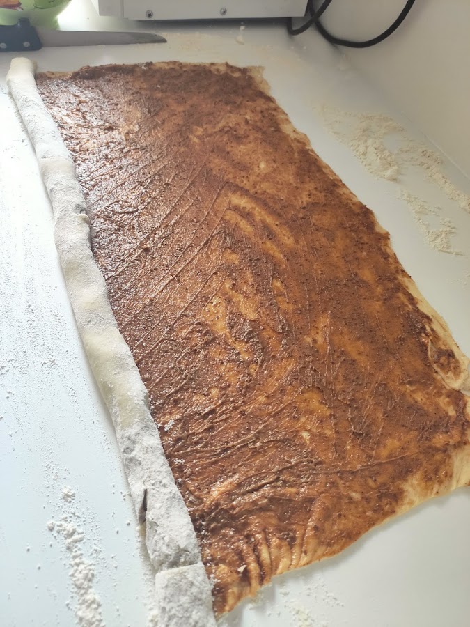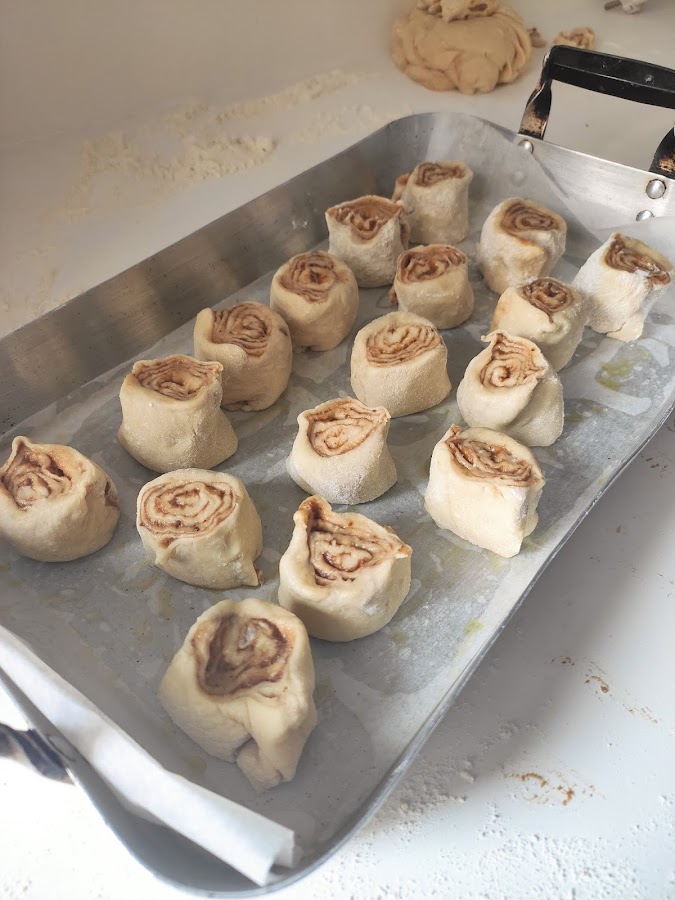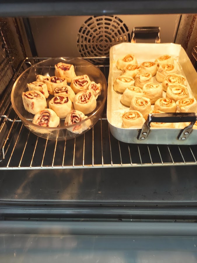 Una vez que la masa haya reposado la hora y media la sacamos a una superficie enharinada y con la ayuda del rodillo hacemos un rectángulo. Untamos con la pasta que hemos hecho para rellenarlo y lo damos forma de salchicha dejando la pasta en el interior. Dividimos la salchicha resultante en trozos y los colocamos en una bandeja de horno o en fuentes apropiadas para horno, a las que habremos pincelado con aceite o mantequilla para que no se peguen los rollitos. Cuando hayamos formado los rollitos debemos dejarlos reposar por espacio de 1 h antes de meterlos en el horno. Tened en cuenta que se expandirán un poquito por lo tanto recordad no ponerlos muy juntos.