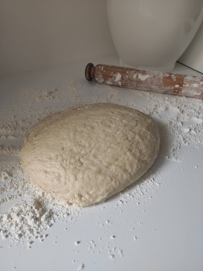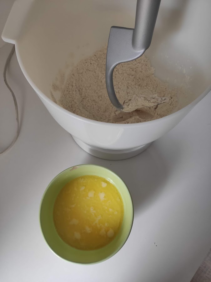 En la máquina de amasar colocamos la harina, el azúcar, la sal, la levadura y mezclamos. Añadimos el huevo y seguimos mezclando. El resto de ingredientes para la masa los calentamos y los añadimos a esta mezcla para hacer una bola que sacamos después a una superficie enharinada y la amasamos un poco hasta que no se pegue en las manos. Cubrimos y dejamos reposando en una ensaladera pincelada con aceite. Debe reposar al menos 1 h 1/2. Veremos que dobla su volumen.