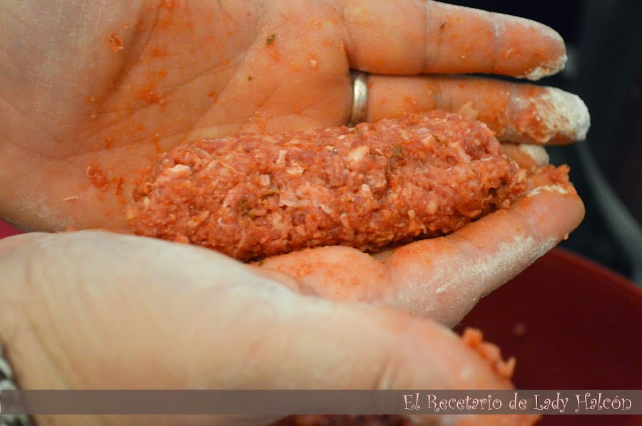 Divide la carne en ocho partes y dale a cada una la forma de un rollito, prensando la carne con las manos.