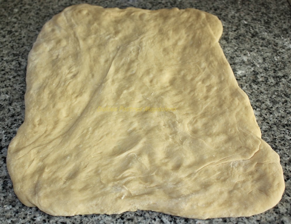 Estira la masa en una superficie enharinada hasta formar la forma de un cuadrado de 30 cm x 30 cm.