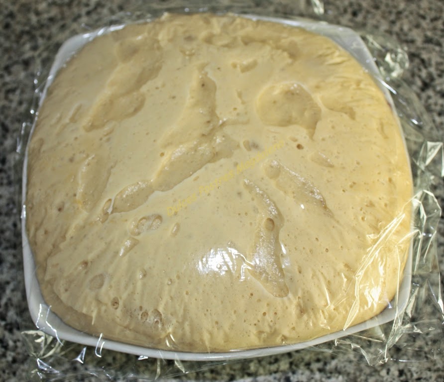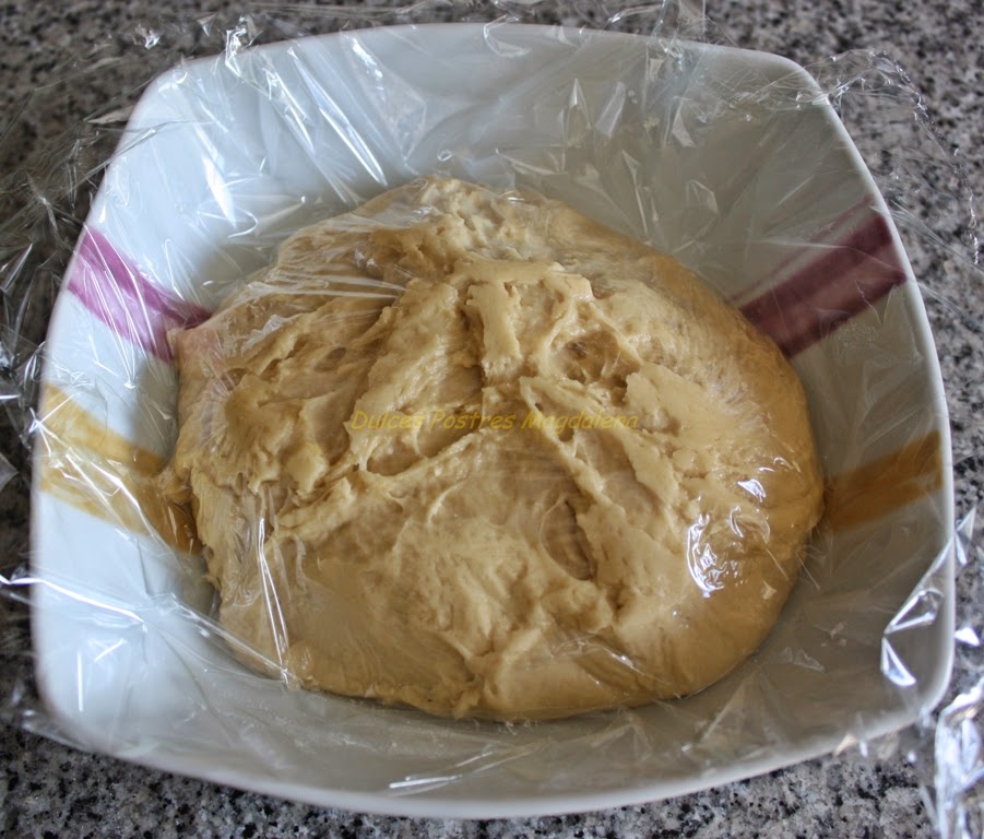 Sacar la masa del vaso de la batidora y ponerla en un bol grande, previamente engrasado, y tapar con papel film. Dejar reposar entre 1 hora y media y 2 horas, hasta que haya duplicado su volumen.