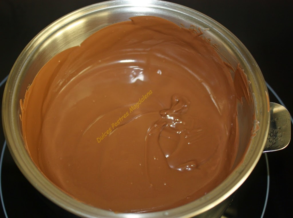 En un cazo al baño maría derretir el chocolate y dejar templar.