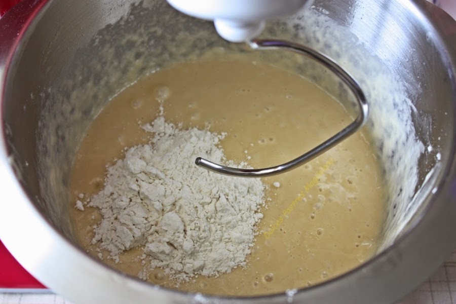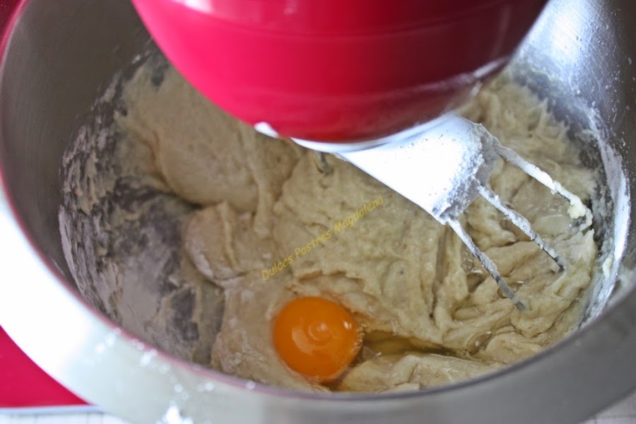 Con la batidora a velocidad baja, añadir la mitad de la mezcla de la harina poco a poco, y después añadir los huevos uno a uno.