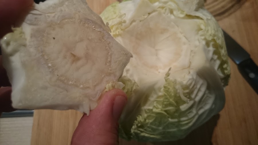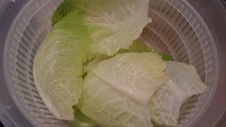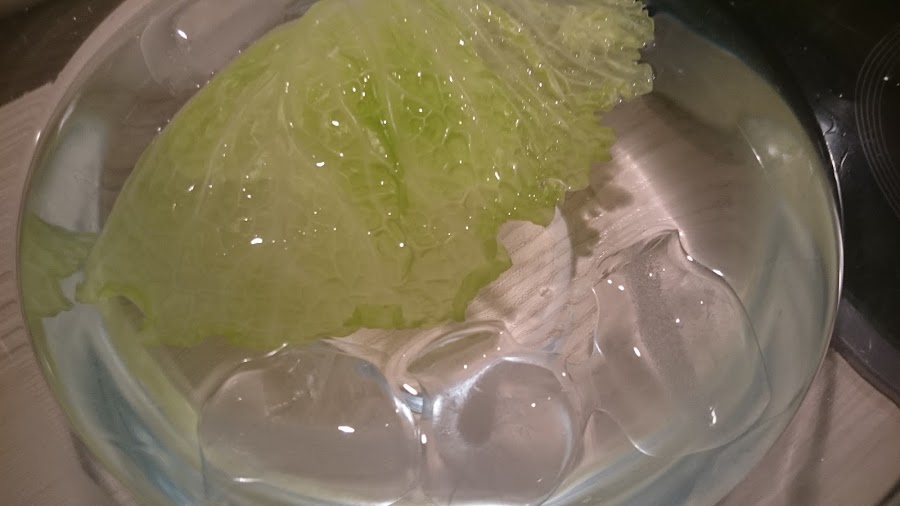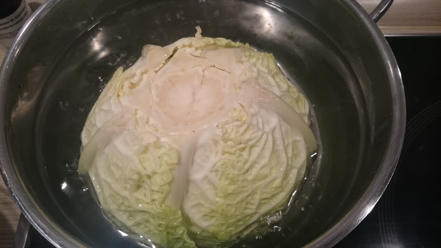 Le quitamos el tallo a la col. En una olla llevamos a ebullición 2 litros de agua (con una pizca de sal) y cocemos la col. Durante el proceso (que nos llevará unos 5 minutos) vamos separando con cuidado las hojas que ya se desprenderán con facilidad.